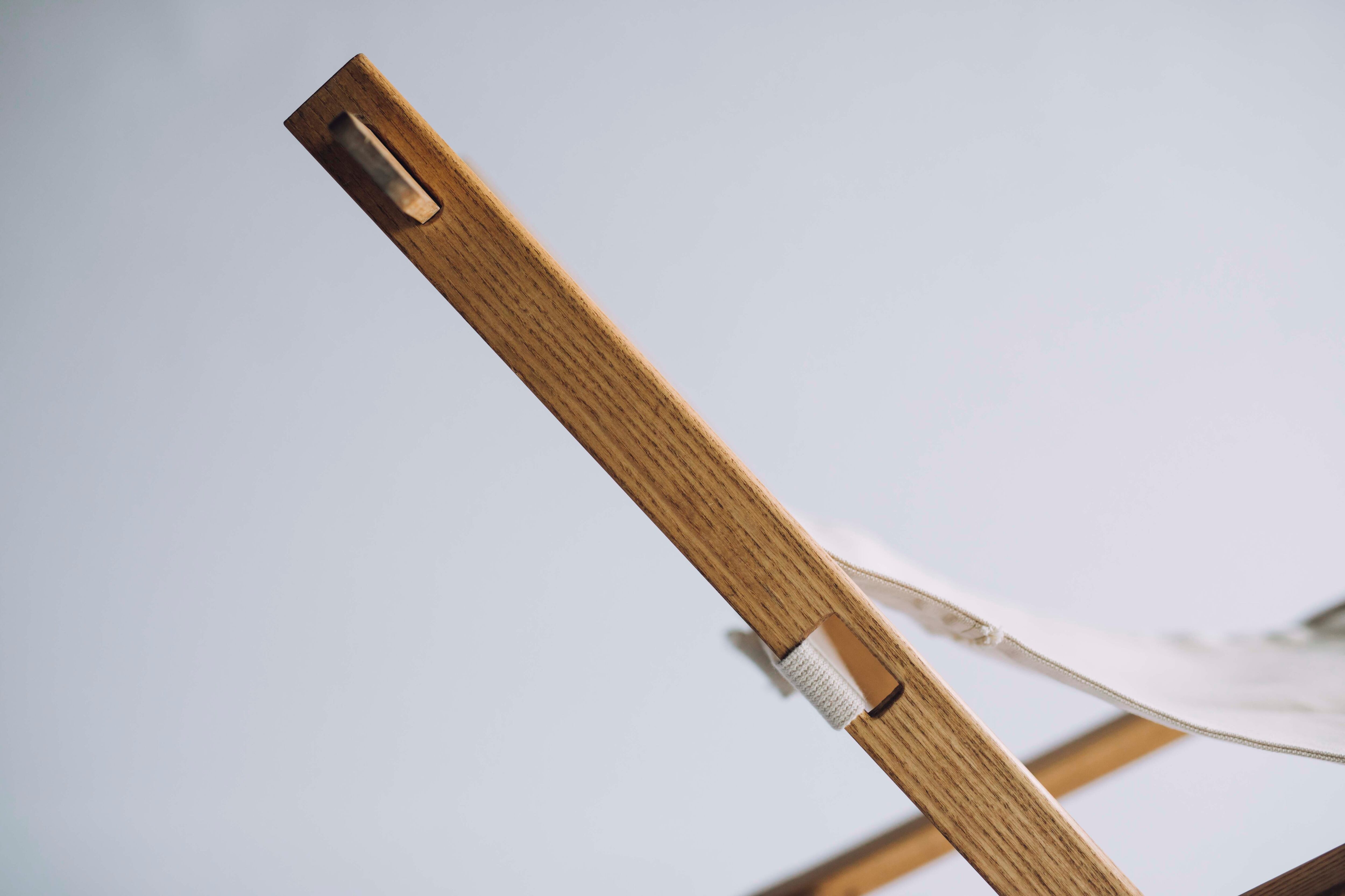 また、体に触れる木部の角に丸みを施し、無垢材ならではのぬくもりと安心感を感じられる仕上がりに。座面には、広島県尾道市の「尾道帆布」を使用した綿100%の厚手帆布を採用し、耐久性と風合いを兼ね備えています。また屋外で利用した後にどうしても汚れてしまうところを、分解できることにより洗濯が容易にできるようになっています。