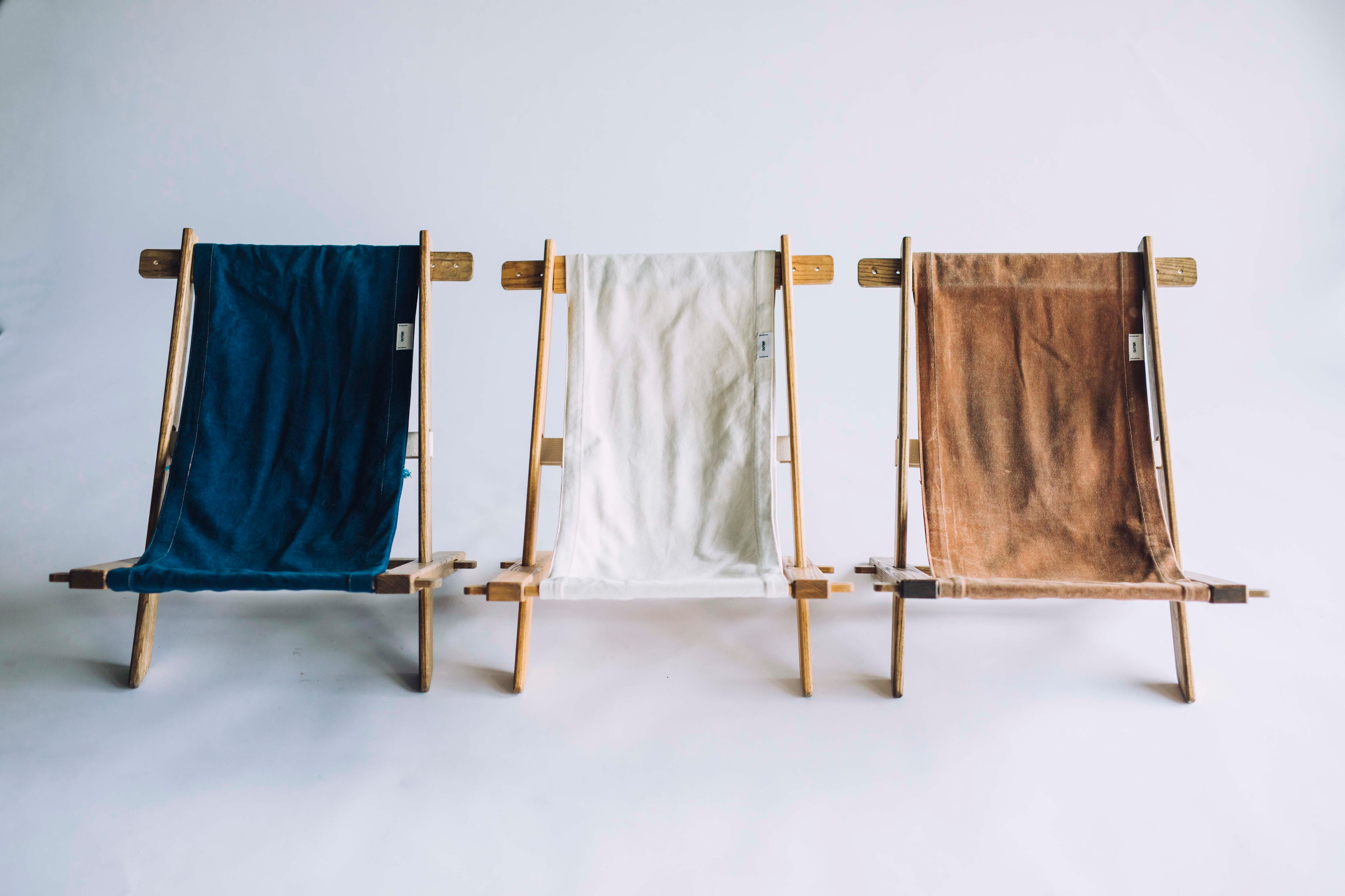 体の当たる木部角は大きめのR加工を施し、無垢の美しさと柔らかさを。座面の布は尾道帆布の綿材を採用し、強度・耐久性も兼ねたものとなりました。何十年も使うことで、無垢の木材と天然素材の帆布が経年変化し、「良い使用感」を生み出してくれます。